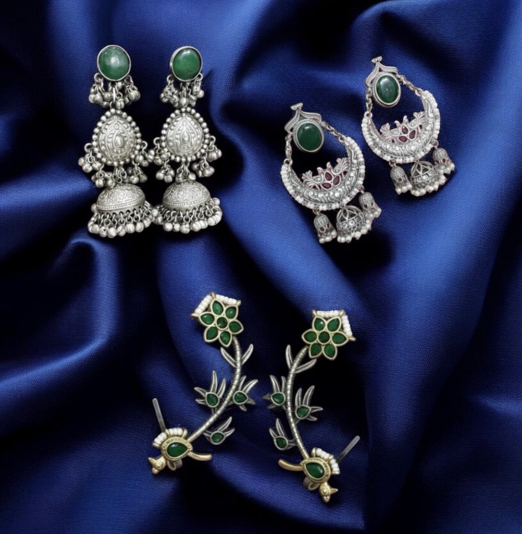 Set Includes: 1 Pair of Oxidised Chandbali Earrings + 1 Floral Vine Kundan Earcuff + 1 Pair of Boho Ghungroo Jhumkas