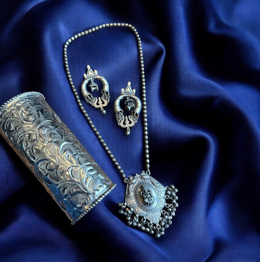 Set Includes: 1 Long German Silver Ganesha Necklace + 1 Pair of Oxidised Silver Earrings + 1 Oxidised Kada