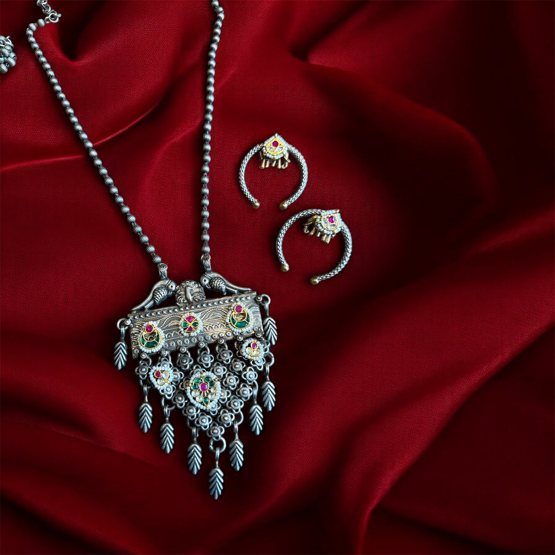 Unleash a powerful style statement on Day 6, dedicated to the fierce Goddess Katyayani. This magnificent combo features a bold German silver necklace adorned with Kundan work and elegant drop pendants, perfectly paired with unique dual-tone moon & elephant studs. The intricate craftsmanship masterfully blends traditional opulence with a contemporary edge.