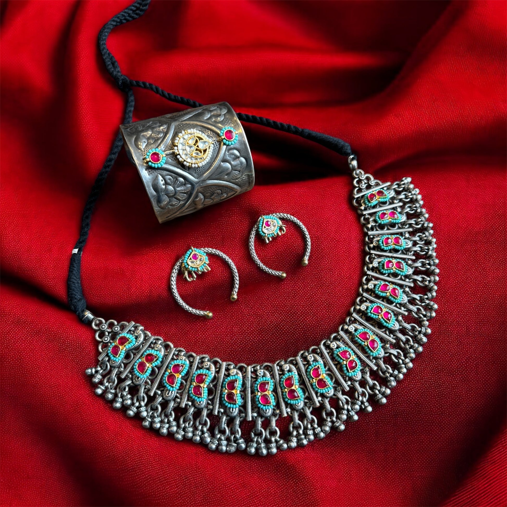 Celebrate Day 8, dedicated to the radiant Goddess Mahagauri, with our 'Regal Fusion' combo. This set masterfully blends traditional Kundan artistry with contemporary design. The German silver choker with turquoise and red accents pops against ethnic wear, while the oxidised Kundan cuff and unique elephant studs add a bold, artistic finish.